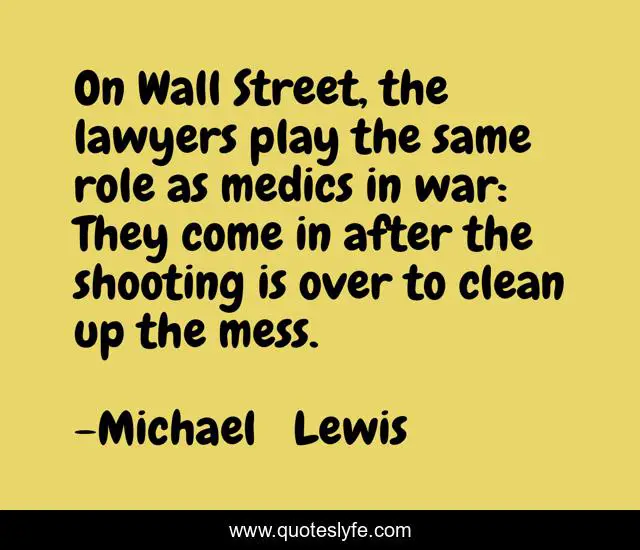 This page presents the quote "On Wall Street, the lawyers play the same role as medics in war: They come in after the shooting is over to clean up the mess.". Author of this quote is Michael Lewis. This quote is about business-culture, humor, law,.