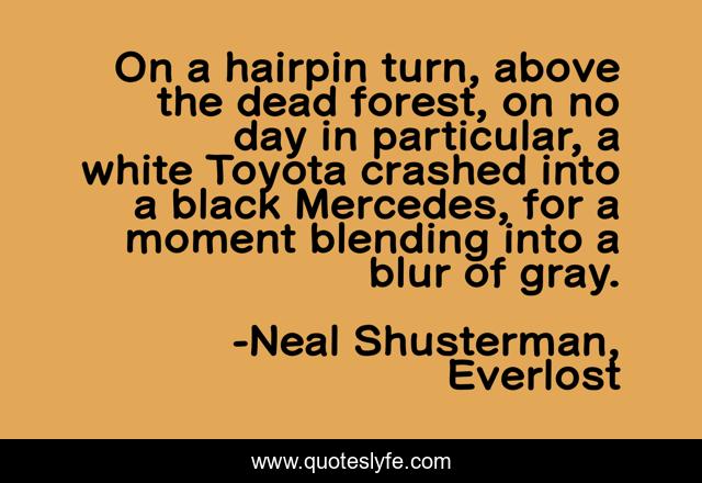 This page presents the quote "On a hairpin turn, above the dead forest, on no day in particular, a white Toyota crashed into a black Mercedes, for a moment blending into a blur of gray.". Author of this quote is Neal Shusterman, Everlost. This quote is about everlost, sci-fi,.