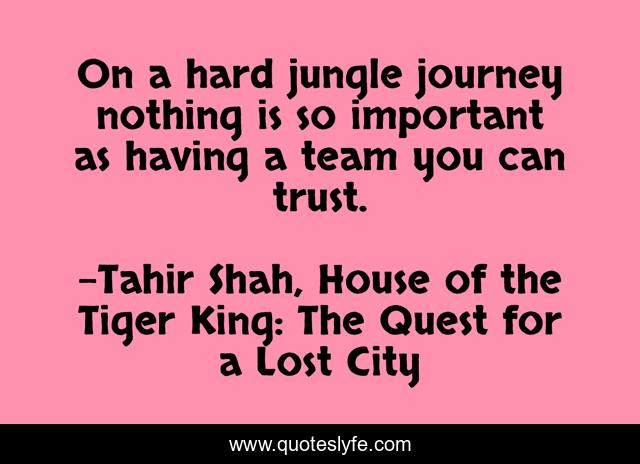 This page presents the quote "On a hard jungle journey nothing is so important as having a team you can trust.". Author of this quote is Tahir Shah, House of the Tiger King: The Quest for a Lost City. This quote is about quest, trust, jungle, journey, team,.