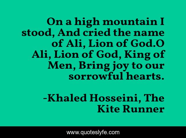 This page presents the quote "On a high mountain I stood, And cried the name of Ali, Lion of God.O Ali, Lion of God, King of Men, Bring joy to our sorrowful hearts.". Author of this quote is Khaled Hosseini, The Kite Runner. This quote is about god, allah, muslim,.