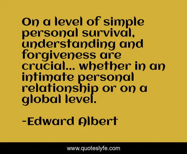This page presents the quote "On a level of simple personal survival, understanding and forgiveness are crucial... whether in an intimate personal relationship or on a global level.". Author of this quote is Edward Albert. This quote is about relationship, personal, quote, survival, actor, forgiveness,.