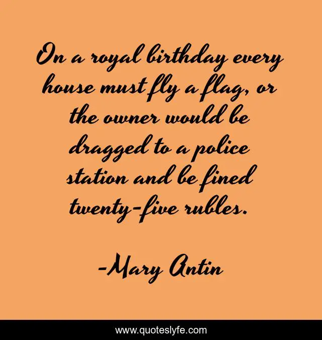This page presents the quote "On a royal birthday every house must fly a flag, or the owner would be dragged to a police station and be fined twenty-five rubles.". Author of this quote is Mary Antin. This quote is about fly, flag, police,.