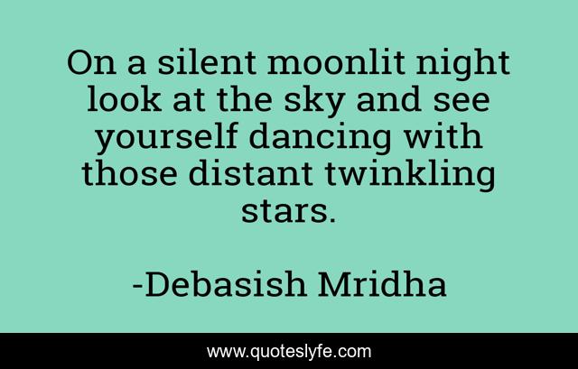 This page presents the quote "On a silent moonlit night look at the sky and see yourself dancing with those distant twinkling stars.". Author of this quote is Debasish Mridha. This quote is about look-at-the-sky, moonlit-night, philosophy, debasish-mridha, quotes, distant-twinkling-stars, debasish-mridha-md, inspirational, enthusiasm,.