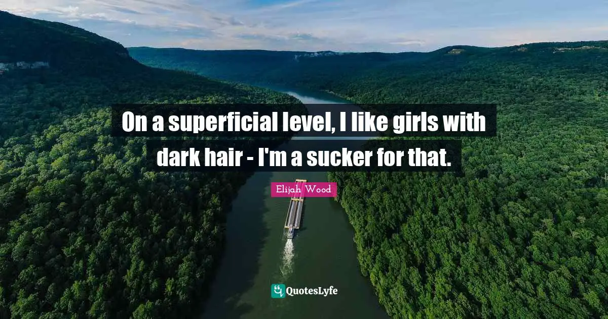 This page presents the quote "On a superficial level, I like girls with dark hair - I'm a sucker for that.". Author of this quote is Elijah Wood. This quote is about dark hair, hair, superficial, girl, sucker, dark,.