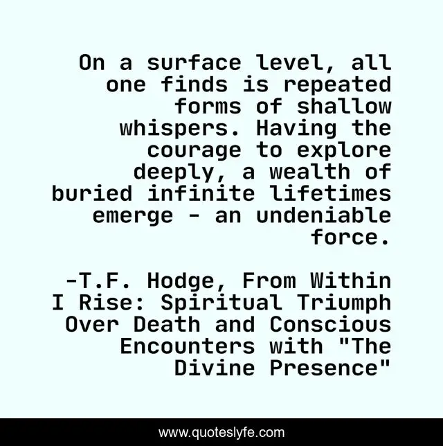 This page presents the quote "On a surface level, all one finds is repeated forms of shallow whispers. Having the courage to explore deeply, a wealth of buried infinite lifetimes emerge - an undeniable force.". Author of this quote is T.F. Hodge, From Within I Rise: Spiritual Triumph Over Death and Conscious Encounters with "The Divine Presence". This quote is about force, self-discovery, energy, soul, self-realization, spiritual-awakening, truth, meditation, illusion,.