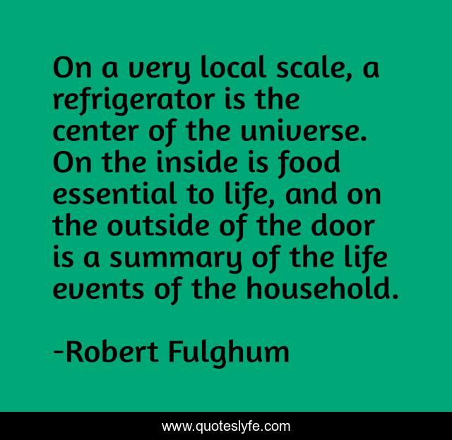 This page presents the quote "On a very local scale, a refrigerator is the center of the universe. On the inside is food essential to life, and on the outside of the door is a summary of the life events of the household.". Author of this quote is Robert Fulghum. This quote is about universe, life, door,.