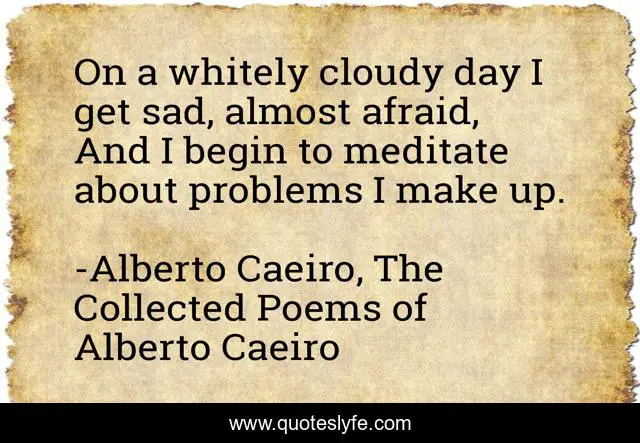 This page presents the quote "On a whitely cloudy day I get sad, almost afraid, And I begin to meditate about problems I make up.". Author of this quote is Alberto Caeiro, The Collected Poems of Alberto Caeiro. This quote is about pantheism, problems, reality, it-is-what-it-is, imagination, meaning, existence, meditation, paganism,.