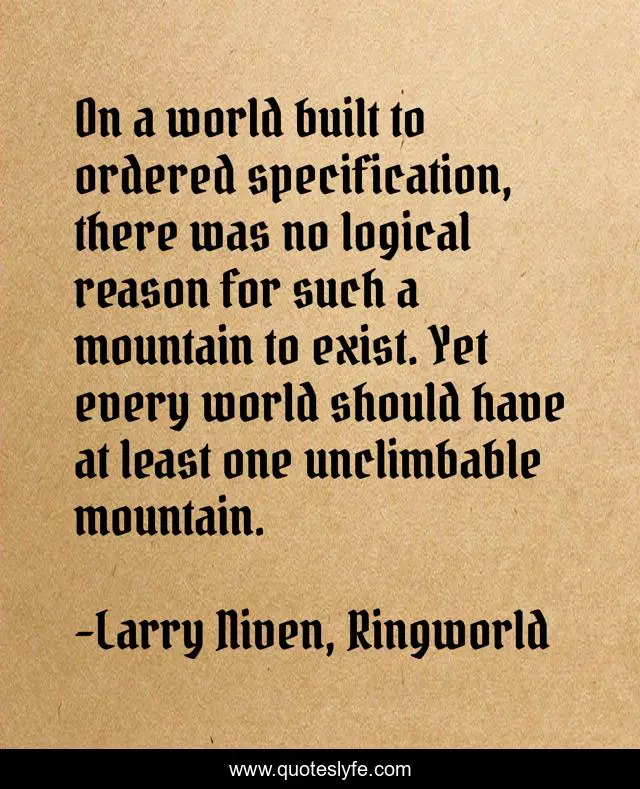 This page presents the quote "On a world built to ordered specification, there was no logical reason for such a mountain to exist. Yet every world should have at least one unclimbable mountain.". Author of this quote is Larry Niven, Ringworld. This quote is about climbing-mountains, mountains, mountain, challenge, engineering, climbing,.