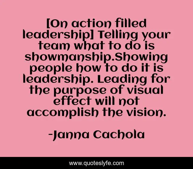 This page presents the quote "[On action filled leadership] Telling your team what to do is showmanship.Showing people how to do it is leadership. Leading for the purpose of visual effect will not accomplish the vision.". Author of this quote is Janna Cachola. This quote is about organisational-leadership, inspire, lead, team-building, actions-over-words, authentic-leadership, culture, organisational-culture, leadership,.