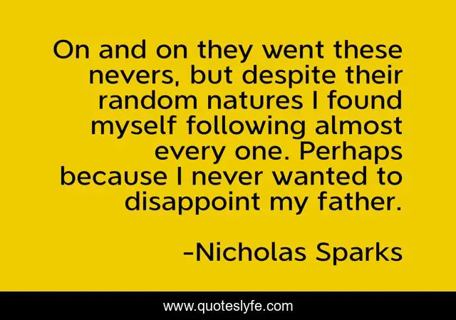 This page presents the quote "On and on they went these nevers, but despite their random natures I found myself following almost every one. Perhaps because I never wanted to disappoint my father.". Author of this quote is Nicholas Sparks. This quote is about father, the-longest-ride, nicholassparks,.