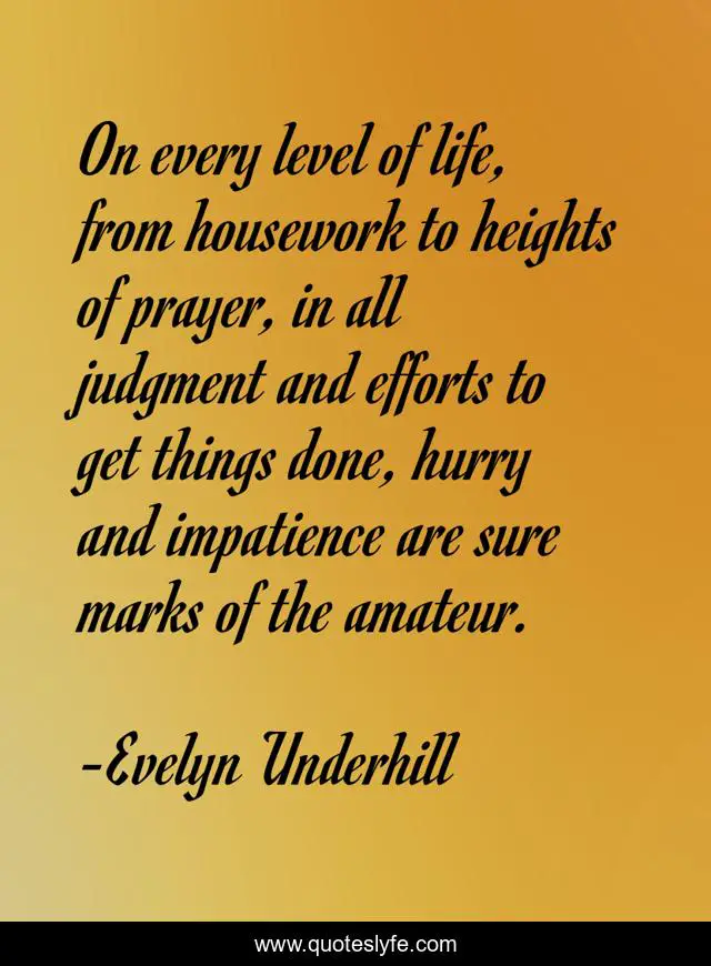 This page presents the quote "On every level of life, from housework to heights of prayer, in all judgment and efforts to get things done, hurry and impatience are sure marks of the amateur.". Author of this quote is Evelyn Underhill. This quote is about faith, life, productivity,.
