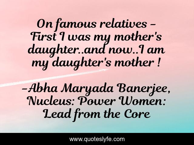 This page presents the quote "On famous relatives - First I was my mother's daughter..and now..I am my daughter's mother !". Author of this quote is Abha Maryada Banerjee, Nucleus: Power Women: Lead from the Core. This quote is about life, love, daughters, affection, mothers,.