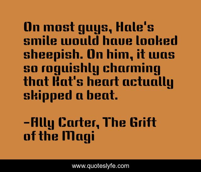 This page presents the quote "On most guys, Hale's smile would have looked sheepish. On him, it was so roguishly charming that Kat's heart actually skipped a beat.". Author of this quote is Ally Carter, The Grift of the Magi. This quote is about love, con-artists, kate, hale, happiness, smile, happy, christmas, affection,.