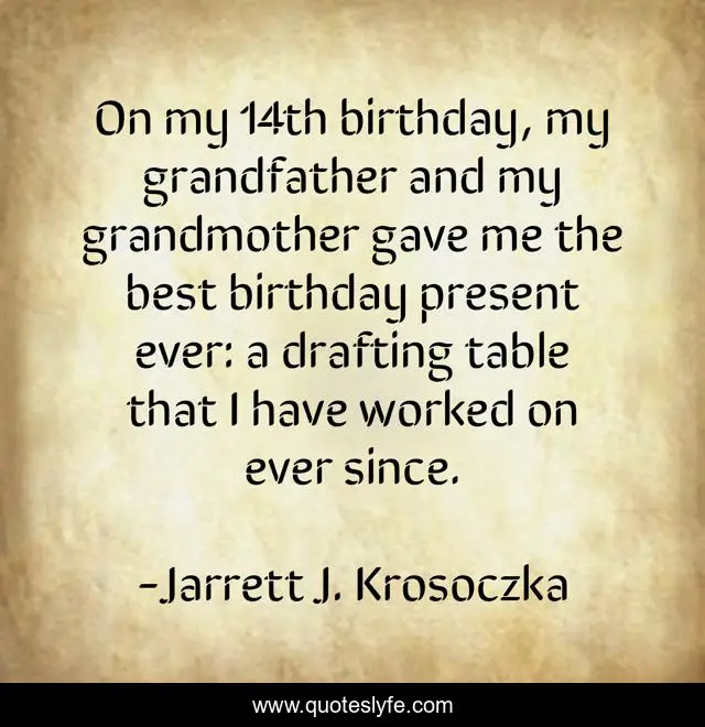 This page presents the quote "On my 14th birthday, my grandfather and my grandmother gave me the best birthday present ever: a drafting table that I have worked on ever since.". Author of this quote is Jarrett J. Krosoczka. This quote is about me, best, present,.