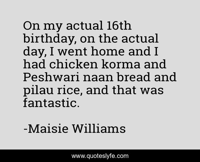 This page presents the quote "On my actual 16th birthday, on the actual day, I went home and I had chicken korma and Peshwari naan bread and pilau rice, and that was fantastic.". Author of this quote is Maisie Williams. This quote is about home, chicken, day,.