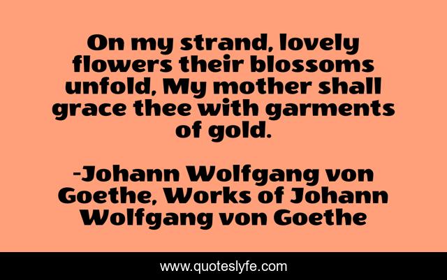 This page presents the quote "On my strand, lovely flowers their blossoms unfold, My mother shall grace thee with garments of gold.". Author of this quote is Johann Wolfgang von Goethe, Works of Johann Wolfgang von Goethe. .