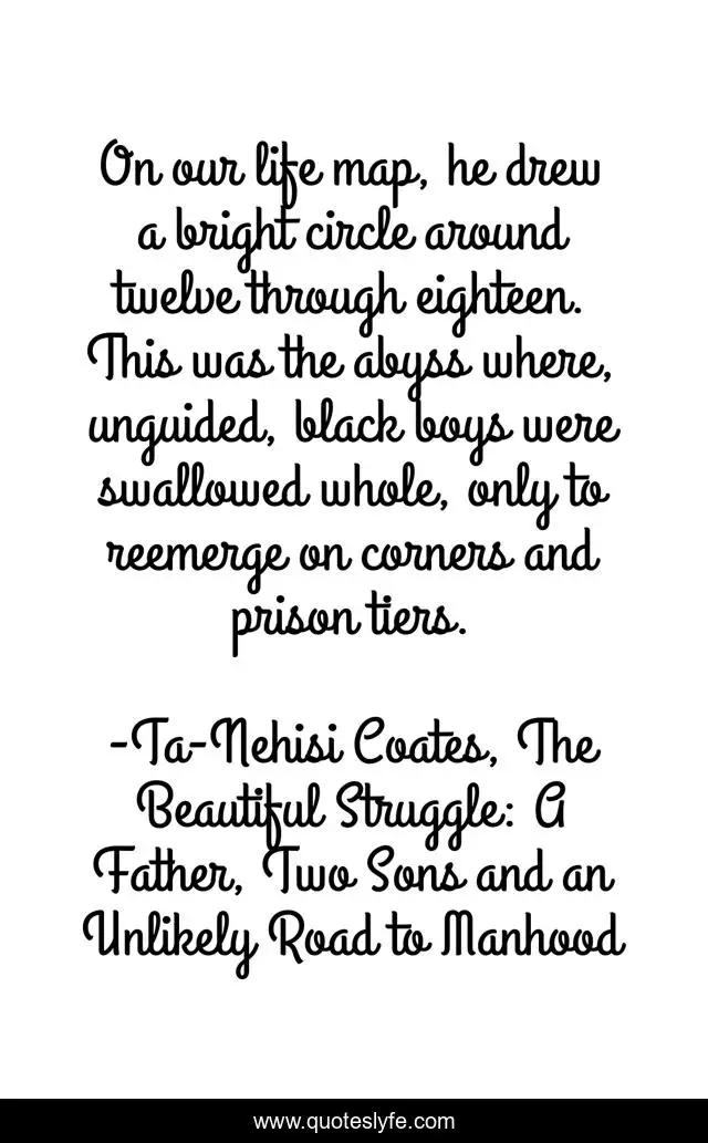 This page presents the quote "On our life map, he drew a bright circle around twelve through eighteen. This was the abyss where, unguided, black boys were swallowed whole, only to reemerge on corners and prison tiers.". Author of this quote is Ta-Nehisi Coates, The Beautiful Struggle: A Father, Two Sons and an Unlikely Road to Manhood. This quote is about race, african-americans,.