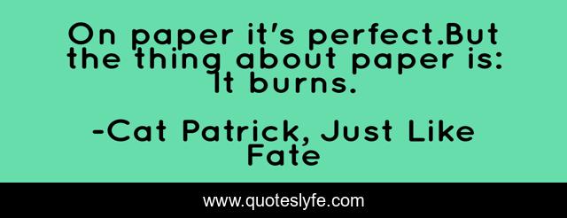 This page presents the quote "On paper it's perfect.But the thing about paper is: It burns.". Author of this quote is Cat Patrick, Just Like Fate. This quote is about love, destiny, fate, just-like-fate, romance, cat-patrick, affection,.