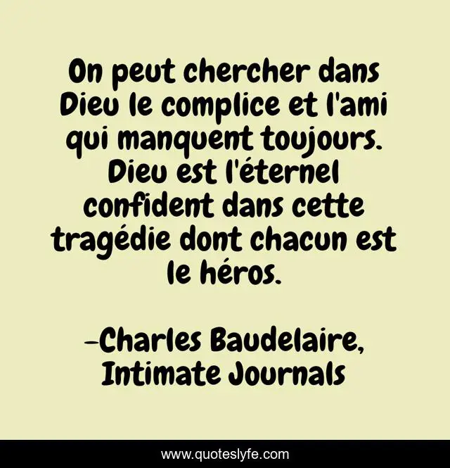 This page presents the quote "On peut chercher dans Dieu le complice et l'ami qui manquent toujours. Dieu est l'éternel confident dans cette tragédie dont chacun est le héros.". Author of this quote is Charles Baudelaire, Intimate Journals. .