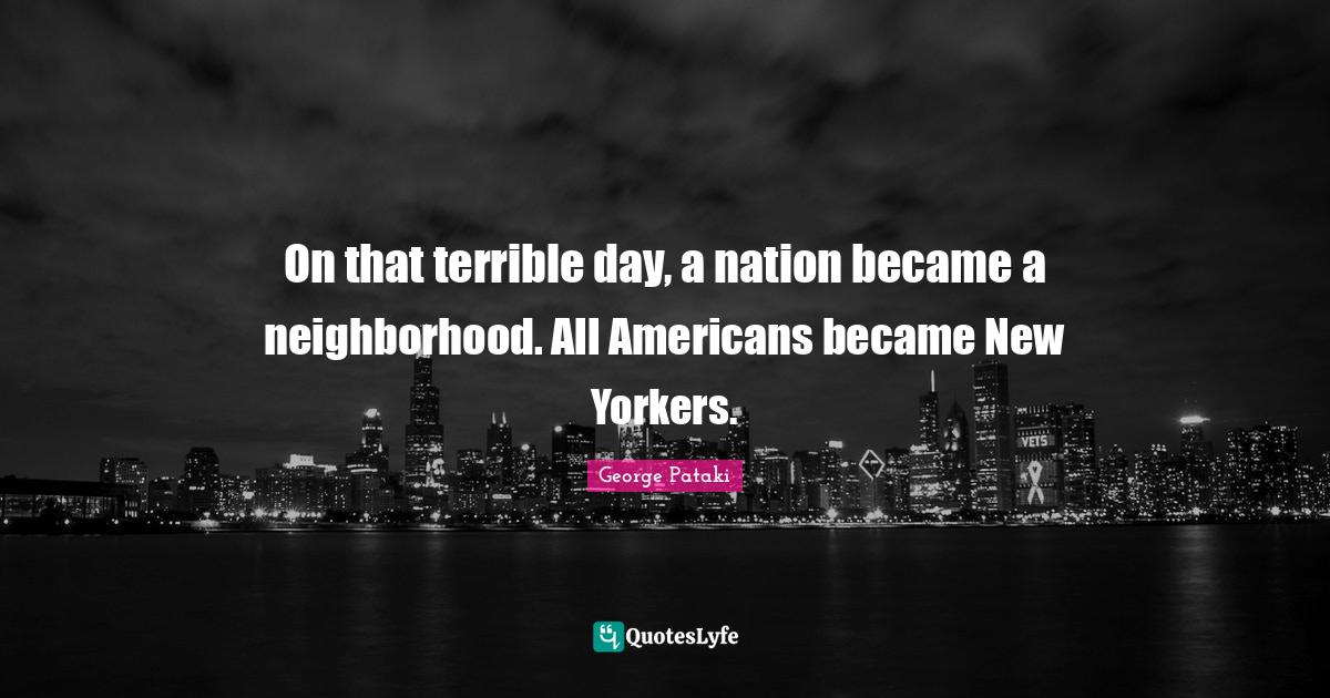 This page presents the quote "On that terrible day, a nation became a neighborhood. All Americans became New Yorkers.". Author of this quote is George Pataki. This quote is about new yorkers, usa, neighborhood, terrible, america, bad day,.