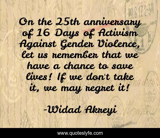 This page presents the quote "On the 25th anniversary of 16 Days of Activism Against Gender Violence, let us remember that we have a chance to save lives! If we don't take it, we may regret it!". Author of this quote is Widad Akreyi. This quote is about violence-against-women, peace, gender-violence, 16-days-of-activism, women-empowerment, dr-widad, widad-akreyi, global-peace,.