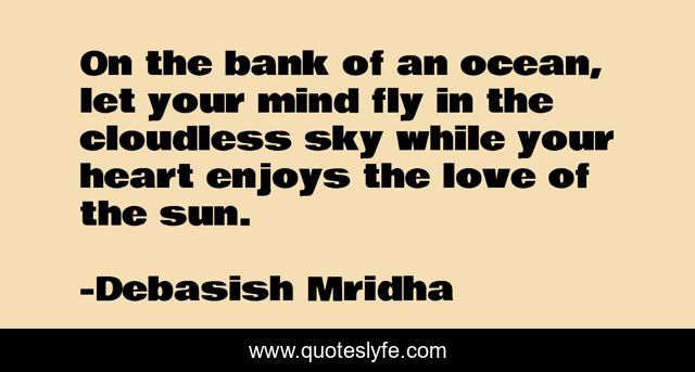 This page presents the quote "On the bank of an ocean, let your mind fly in the cloudless sky while your heart enjoys the love of the sun.". Author of this quote is Debasish Mridha. This quote is about life, love, knowledge, inspirational, intelligence, philosophy, wisdom, quotes, affection,.