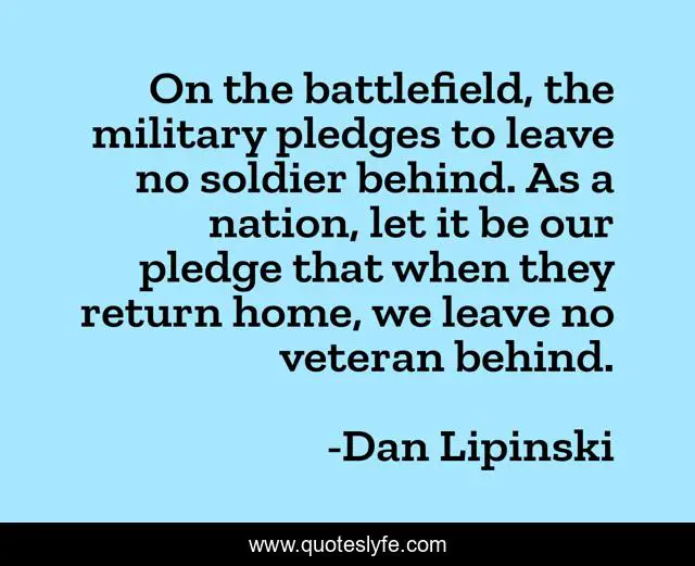 This page presents the quote "On the battlefield, the military pledges to leave no soldier behind. As a nation, let it be our pledge that when they return home, we leave no veteran behind.". Author of this quote is Dan Lipinski. This quote is about soldier, military, nation,.
