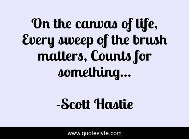This page presents the quote "On the canvas of life, Every sweep of the brush matters, Counts for something…". Author of this quote is Scott Hastie. This quote is about count, poem, canvas, art, philosophy, life, spiritual, canvas-of-life, matters,.