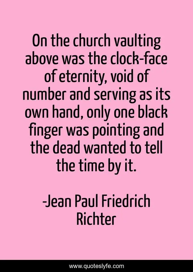 This page presents the quote "On the church vaulting above was the clock-face of eternity, void of number and serving as its own hand, only one black finger was pointing and the dead wanted to tell the time by it.". Author of this quote is Jean Paul Friedrich Richter. This quote is about eternity, death, church, atheism, religion, time,.