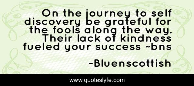 This page presents the quote "On the journey to self discovery be grateful for the fools along the way. Their lack of kindness fueled your success ~bns". Author of this quote is Bluenscottish. This quote is about leadership, success,.