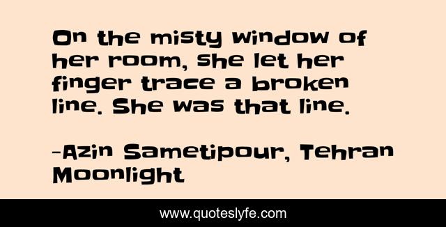 This page presents the quote "On the misty window of her room, she let her finger trace a broken line. She was that line.". Author of this quote is Azin Sametipour, Tehran Moonlight. This quote is about moonlight, iran, fiction, romance, tehran, women,.