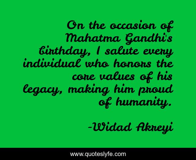This page presents the quote "On the occasion of Mahatma Gandhi's birthday, I salute every individual who honors the core values of his legacy, making him proud of humanity.". Author of this quote is Widad Akreyi. This quote is about peace, peacemakers, legacy, gandhi, inspirational, enthusiasm, humanity,.
