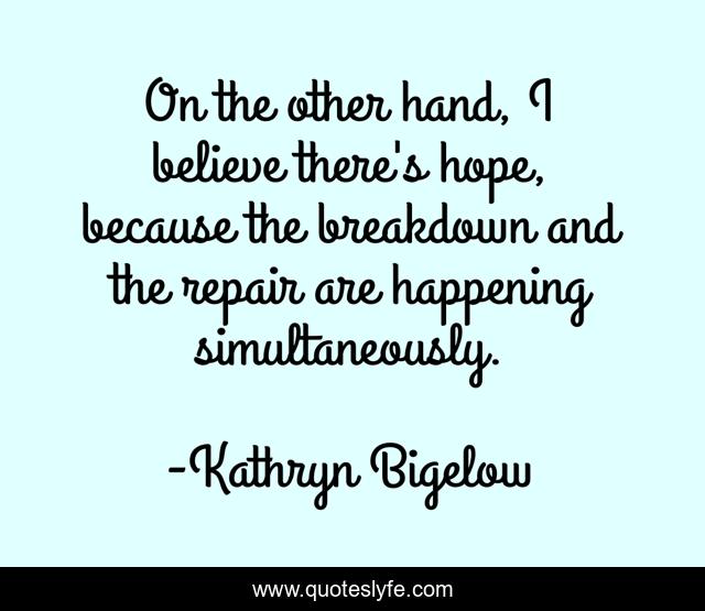 This page presents the quote "On the other hand, I believe there's hope, because the breakdown and the repair are happening simultaneously.". Author of this quote is Kathryn Bigelow. This quote is about i believe, believe,.