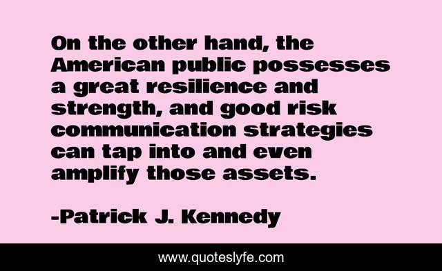 This page presents the quote "On the other hand, the American public possesses a great resilience and strength, and good risk communication strategies can tap into and even amplify those assets.". Author of this quote is Patrick J. Kennedy. This quote is about great, good, strength,.