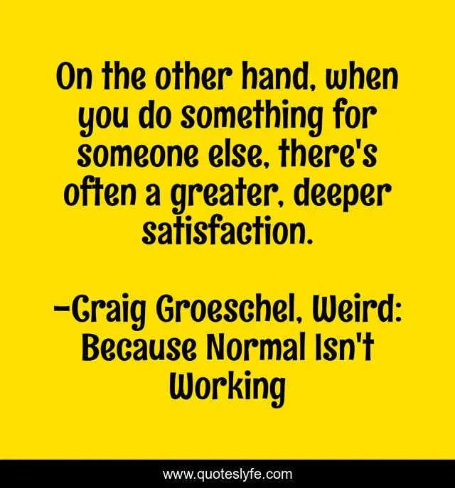 This page presents the quote "On the other hand, when you do something for someone else, there's often a greater, deeper satisfaction.". Author of this quote is Craig Groeschel, Weird: Because Normal Isn't Working. This quote is about a, there-s, someone, greater, for, deeper, else, satisfaction, something,.