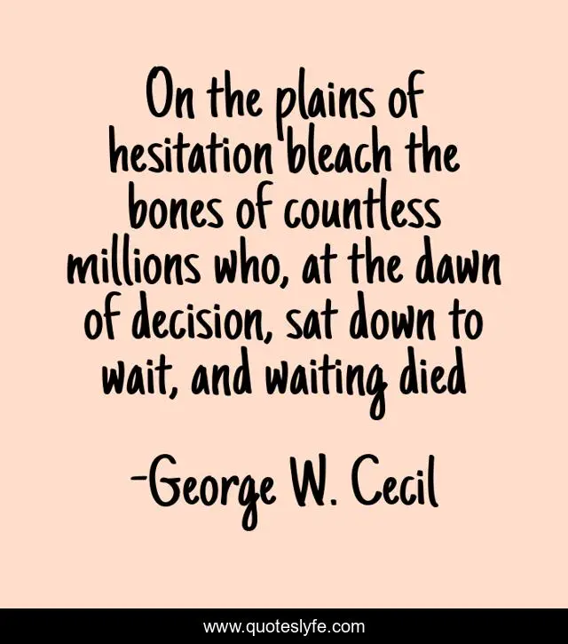 This page presents the quote "On the plains of hesitation bleach the bones of countless millions who, at the dawn of decision, sat down to wait, and waiting died". Author of this quote is George W. Cecil. This quote is about take-action, hesitation, decision, action, waiting, act, bones, countless, wait,.