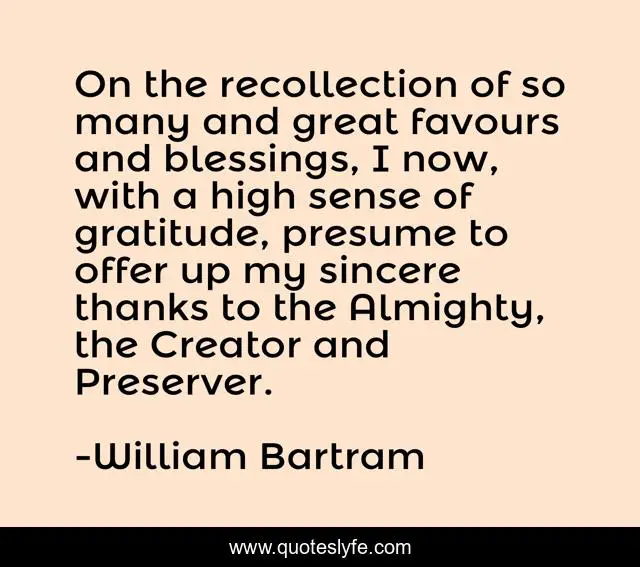 This page presents the quote "On the recollection of so many and great favours and blessings, I now, with a high sense of gratitude, presume to offer up my sincere thanks to the Almighty, the Creator and Preserver.". Author of this quote is William Bartram. This quote is about gratitude, great, blessings,.