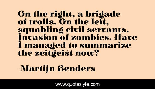 This page presents the quote "On the right, a brigade of trolls. On the left, squabling civil servants. Invasion of zombies. Have I managed to summarize the zeitgeist now?". Author of this quote is Martijn Benders. This quote is about zeitgeist, trolls, zombies,.