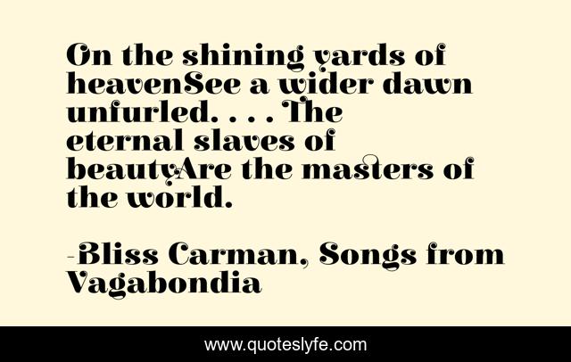 This page presents the quote "On the shining yards of heavenSee a wider dawn unfurled. . . . The eternal slaves of beautyAre the masters of the world.". Author of this quote is Bliss Carman, Songs from Vagabondia. This quote is about poetry, beauty,.