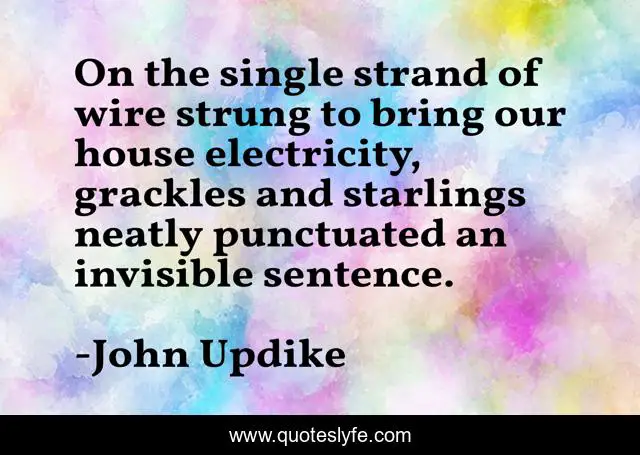This page presents the quote "On the single strand of wire strung to bring our house electricity, grackles and starlings neatly punctuated an invisible sentence.". Author of this quote is John Updike. This quote is about visualization, wire, sentence, pictures, visual, words, birds, punctuations,.