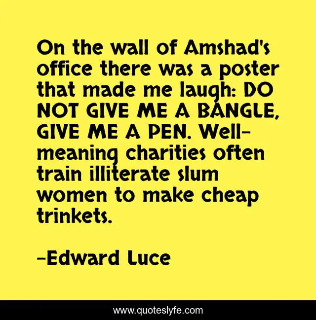 This page presents the quote "On the wall of Amshad's office there was a poster that made me laugh: DO NOT GIVE ME A BANGLE, GIVE ME A PEN. Well-meaning charities often train illiterate slum women to make cheap trinkets.". Author of this quote is Edward Luce. This quote is about charity, india, literacy,.