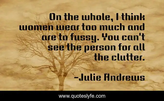 This page presents the quote "On the whole, I think women wear too much and are to fussy. You can't see the person for all the clutter.". Author of this quote is Julie Andrews. This quote is about see, think,.
