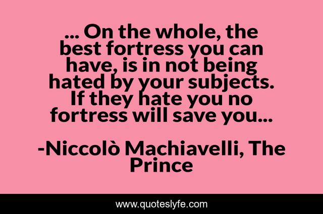 This page presents the quote "... On the whole, the best fortress you can have, is in not being hated by your subjects. If they hate you no fortress will save you...". Author of this quote is Niccolò Machiavelli, The Prince. This quote is about politics, plebians, politicians,.