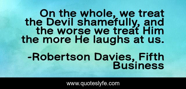 This page presents the quote "On the whole, we treat the Devil shamefully, and the worse we treat Him the more He laughs at us.". Author of this quote is Robertson Davies, Fifth Business. This quote is about disrespect, religion, laughter, the-devil, satan,.