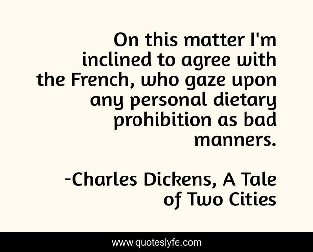 This page presents the quote "On this matter I'm inclined to agree with the French, who gaze upon any personal dietary prohibition as bad manners.". Author of this quote is Charles Dickens, A Tale of Two Cities. This quote is about food, humor, french,.