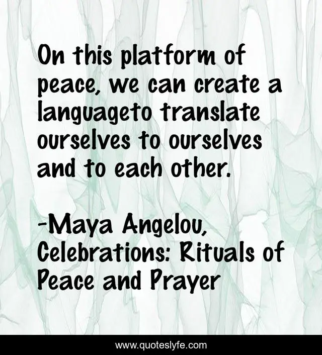 This page presents the quote "On this platform of peace, we can create a languageto translate ourselves to ourselves and to each other.". Author of this quote is Maya Angelou, Celebrations: Rituals of Peace and Prayer. .