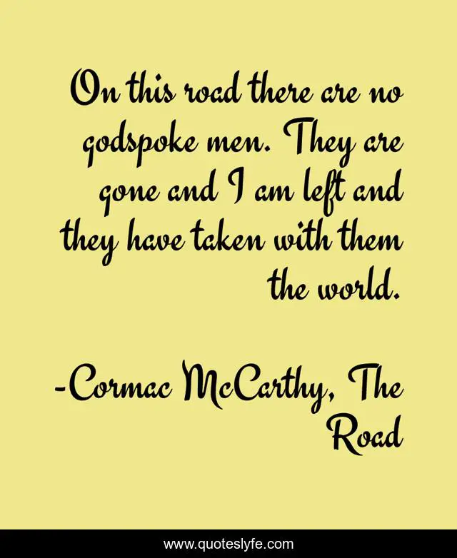This page presents the quote "On this road there are no godspoke men. They are gone and I am left and they have taken with them the world.". Author of this quote is Cormac McCarthy, The Road. This quote is about desolation, life, loneliness,.