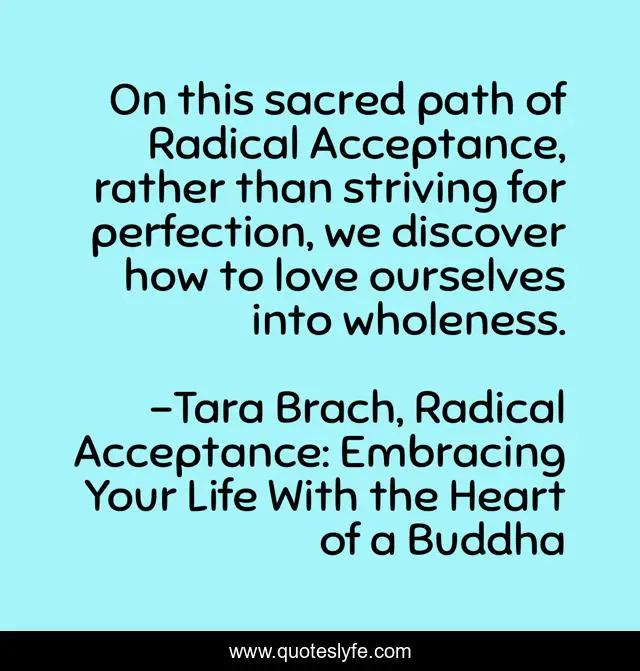 This page presents the quote "On this sacred path of Radical Acceptance, rather than striving for perfection, we discover how to love ourselves into wholeness.". Author of this quote is Tara Brach, Radical Acceptance: Embracing Your Life With the Heart of a Buddha. This quote is about acceptance, perfectionism, wholeness,.