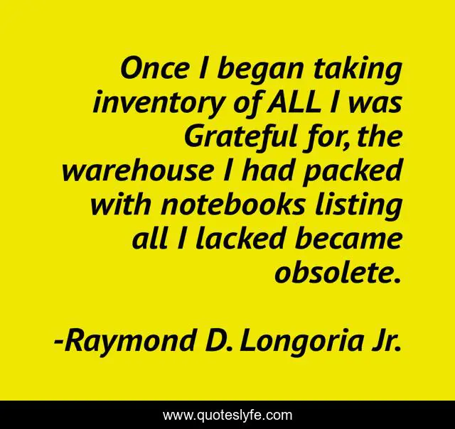 This page presents the quote "Once I began taking inventory of ALL I was Grateful for, the warehouse I had packed with notebooks listing all I lacked became obsolete.". Author of this quote is Raymond D. Longoria Jr.. This quote is about life, freedom, peace, spiritual, soul, change, purpose, self-help, friendship,.
