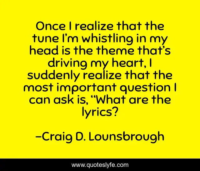 This page presents the quote "Once I realize that the tune I’m whistling in my head is the theme that’s driving my heart, I suddenly realize that the most important question I can ask is, “What are the lyrics?". Author of this quote is Craig D. Lounsbrough. This quote is about heart, head, goal, lyrics, influenced, influence, drivers, dictates, question,.